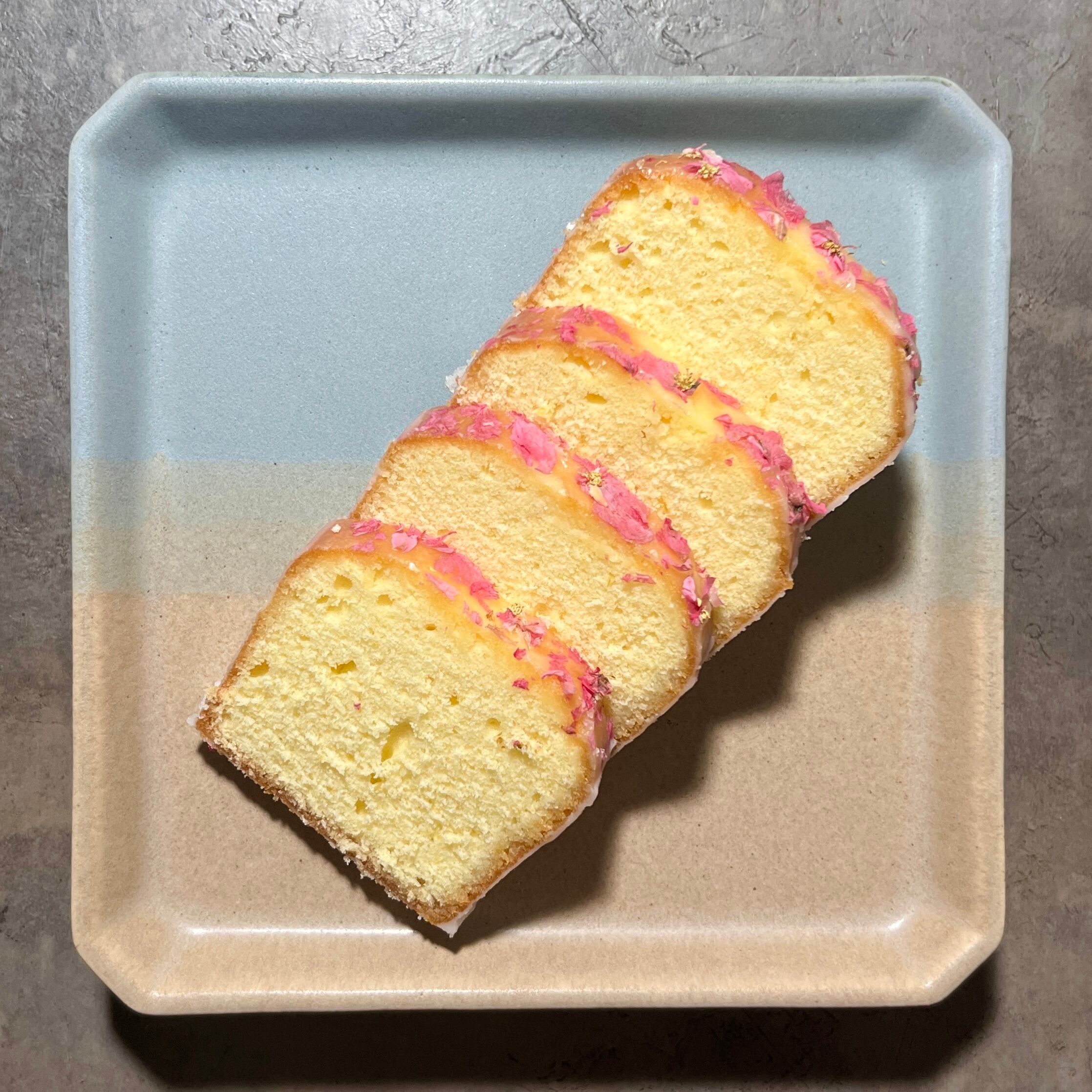 表面にはレモンのアイシングと上部はピンクのエディブルフラワーをあしらい、
