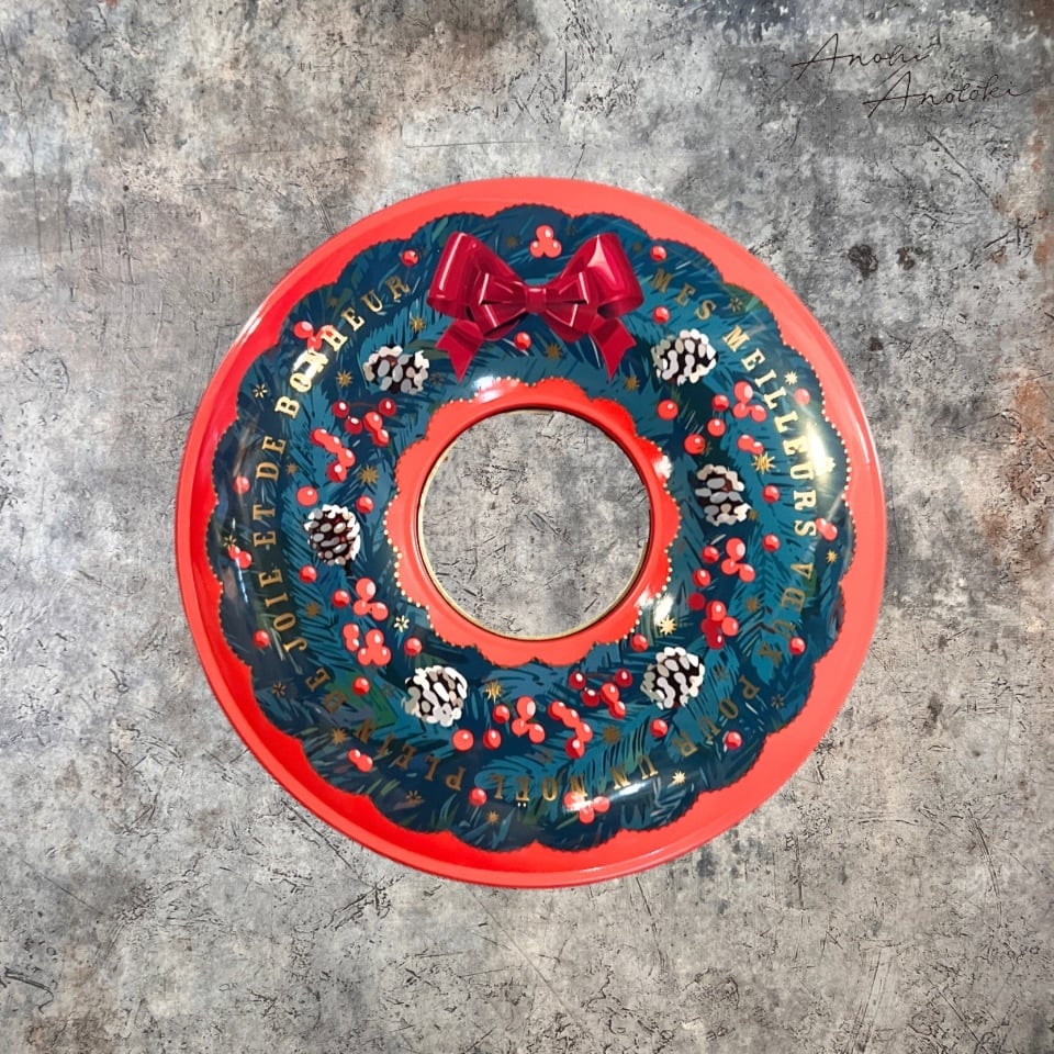 冬の贈り物やお茶うけにピッタリな、リースの形をしたかわいらしいクッキー缶です!